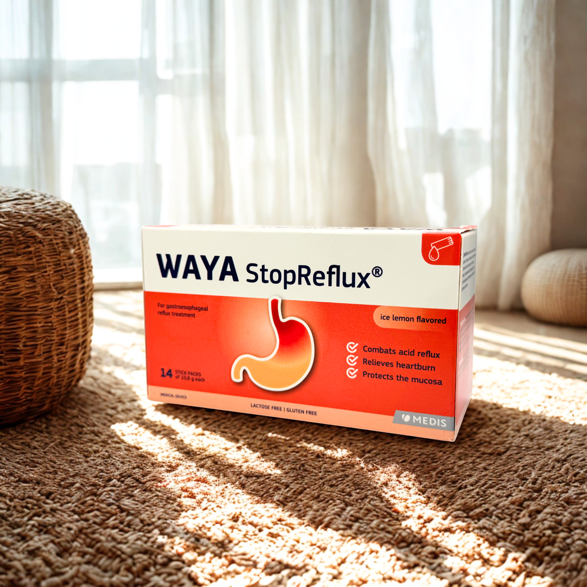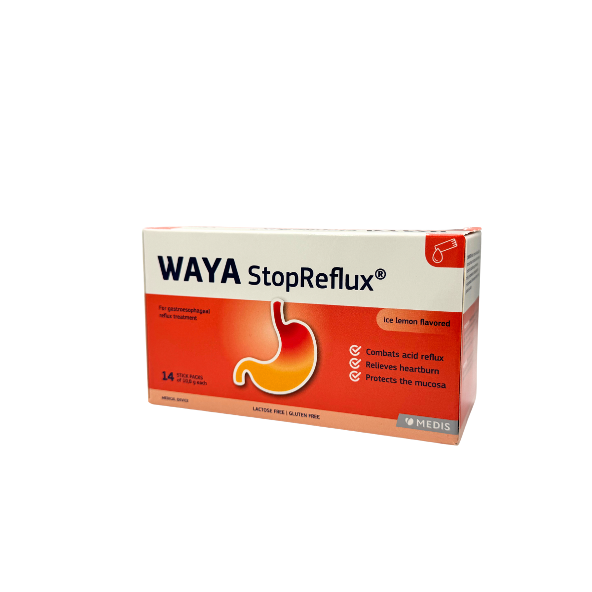 WAYA StopReflux – skysta geriamoji suspensija, skirta greitai ir efektyviai palengvinti gastroezofaginio refliukso simptomus. Produktas mechaniškai apsaugo nuo skrandžio rūgšties refliukso per mažiau nei 3 minutes, mažina rėmenį ir padeda atkurti skrandžio bei stemplės gleivinę.