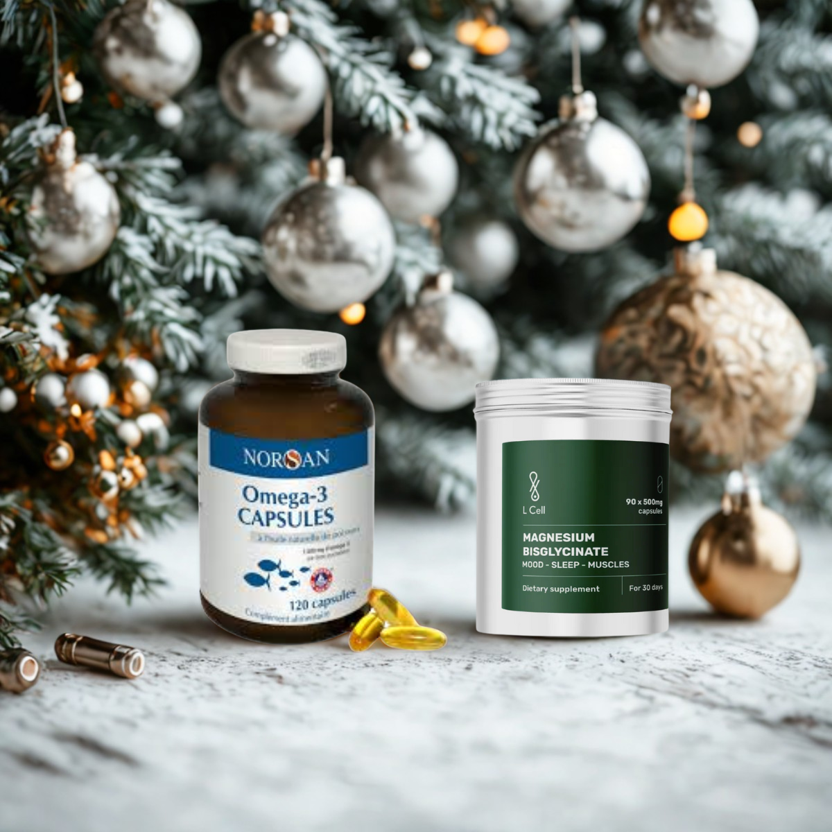 Šventinis rinkinys JAM, siekiančiam palaikyti energiją, gerą savijautą ir vidinę pusiausvyrą – Magnio bisglicinatas mažina nuovargį ir palaiko nervų bei raumenų veiklą, o Omega-3 rūpinasi širdimi, smegenimis ir regėjimu.